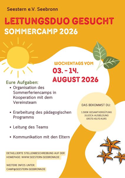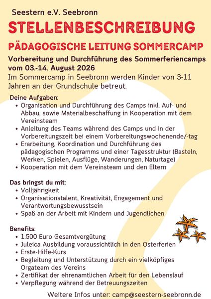 Wir suchen motivierte und engagierte junge Menschen fĂĽr die Betreuung von Kindern im Seebronner Sommerferiencamp 2026.